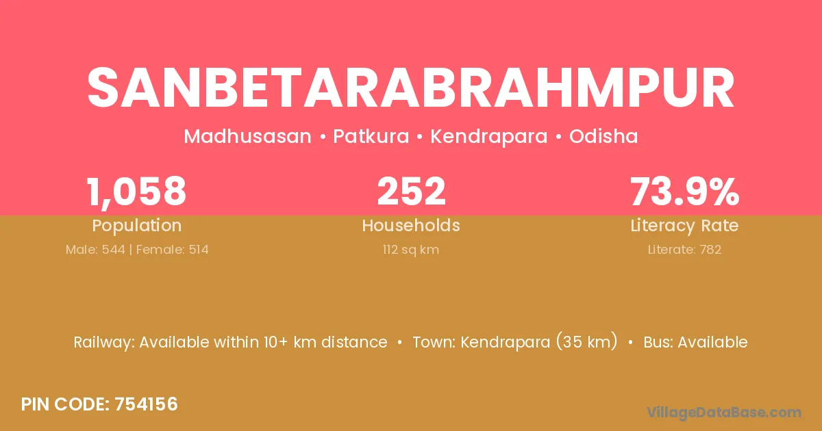 Sanbetarabrahmpur village has a total population of 1,058 people, of which 544 are males and 514 are females.