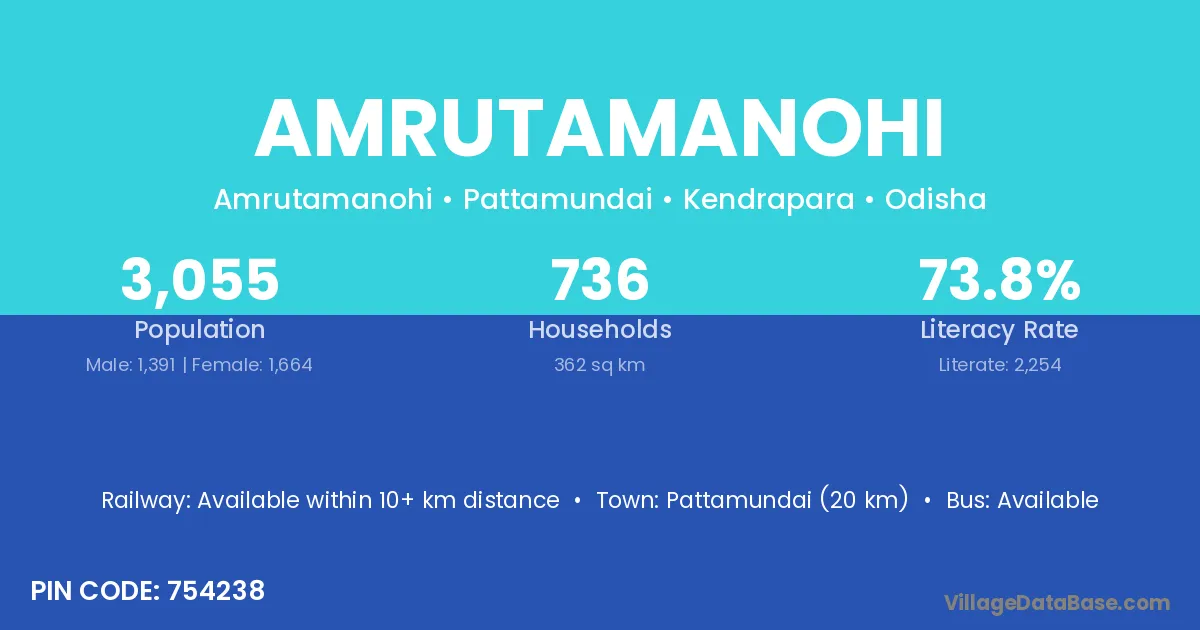 Pattamundai (20 km) is the nearest town to Amrutamanohi village for major economic activities and is located approximately 20 km away.