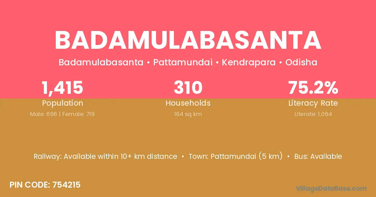 Pattamundai (5 km) is the nearest town to Badamulabasanta village for major economic activities and is located approximately 5 km away.