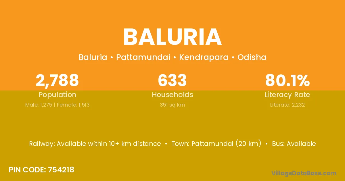Pattamundai (20 km) is the nearest town to Baluria village for major economic activities and is located approximately 20 km away.
