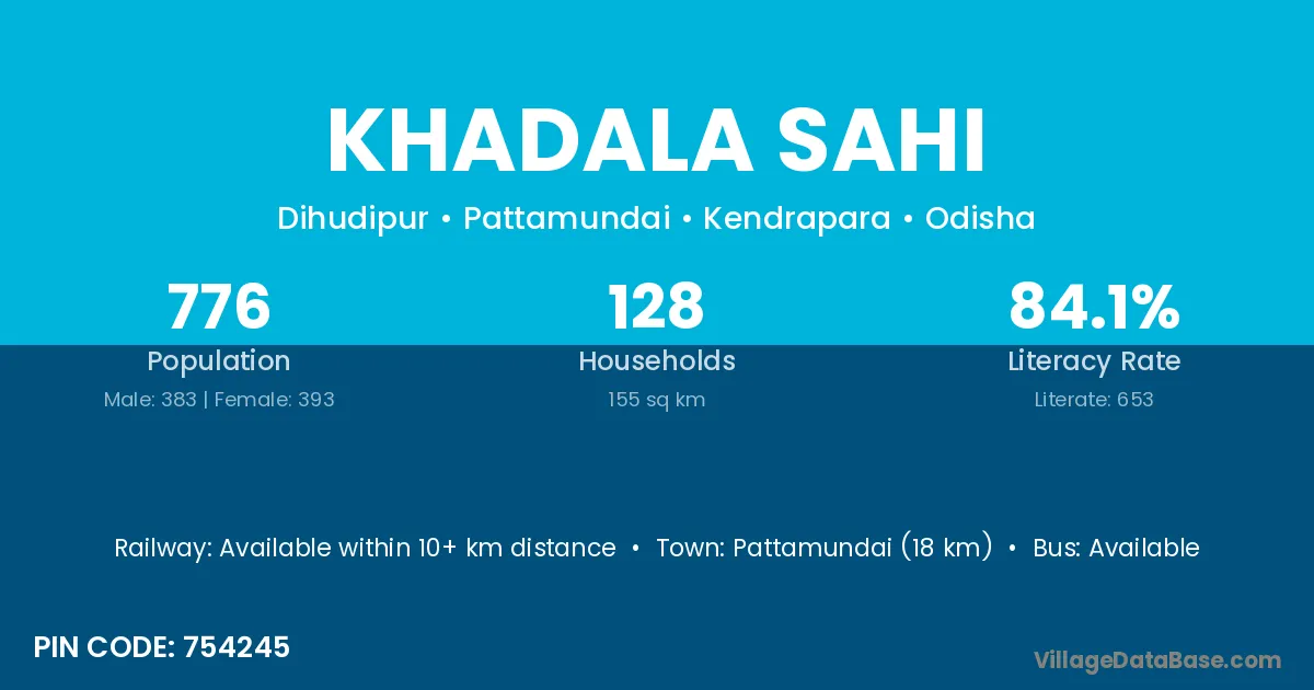 Pattamundai (18 km) is the nearest town to Khadala Sahi village for major economic activities and is located approximately 18 km away.