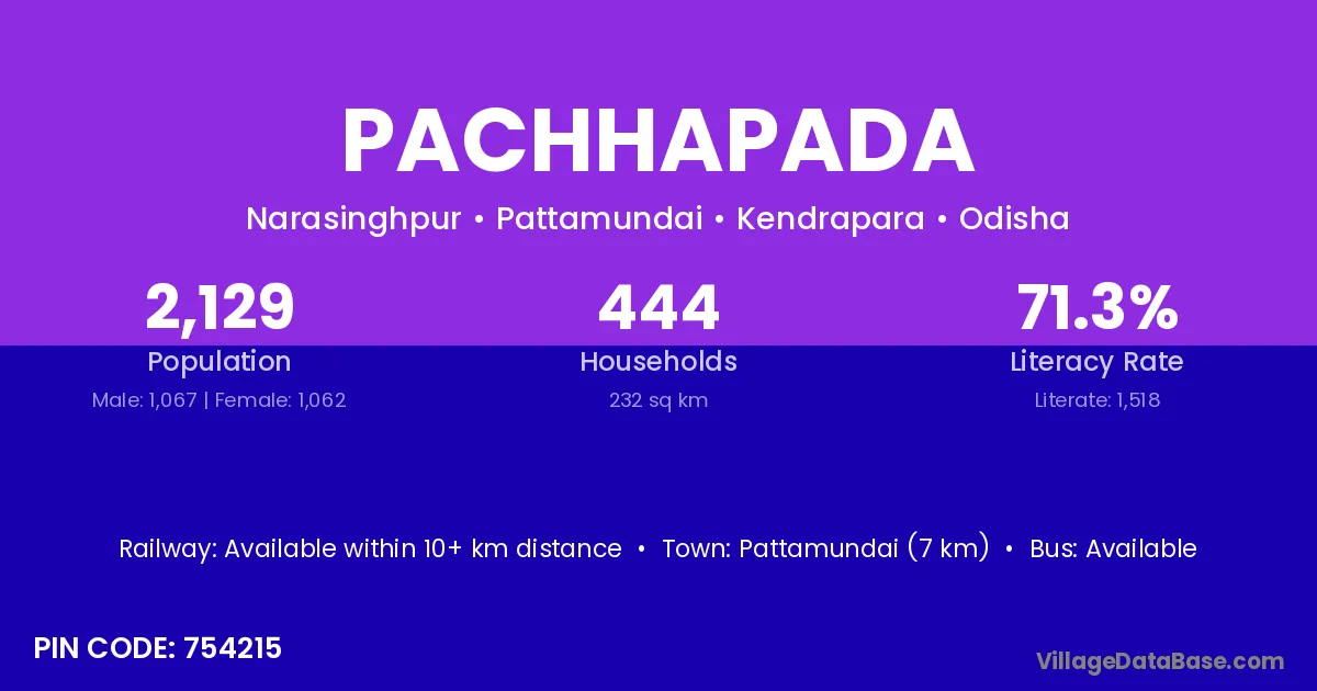 Pattamundai (7 km) is the nearest town to Pachhapada village for major economic activities and is located approximately 7 km away.