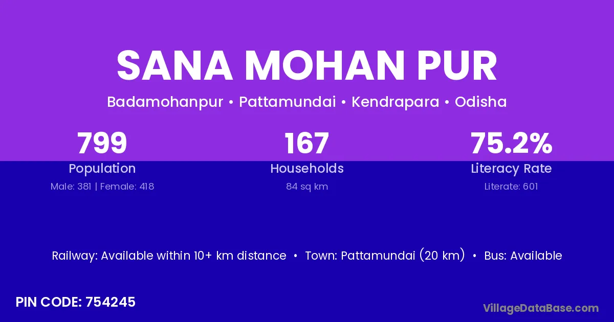 Pattamundai (20 km) is the nearest town to Sana Mohan Pur village for major economic activities and is located approximately 20 km away.