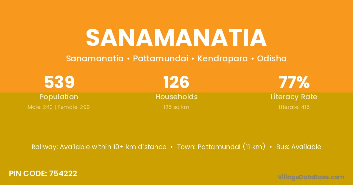 Pattamundai (11 km) is the nearest town to Sanamanatia village for major economic activities and is located approximately 11 km away.