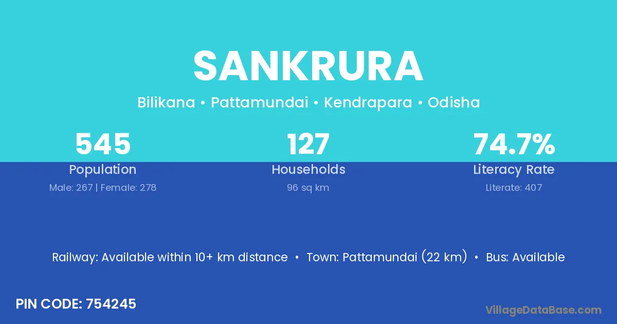 Pattamundai (22 km) is the nearest town to Sankrura village for major economic activities and is located approximately 22 km away.
