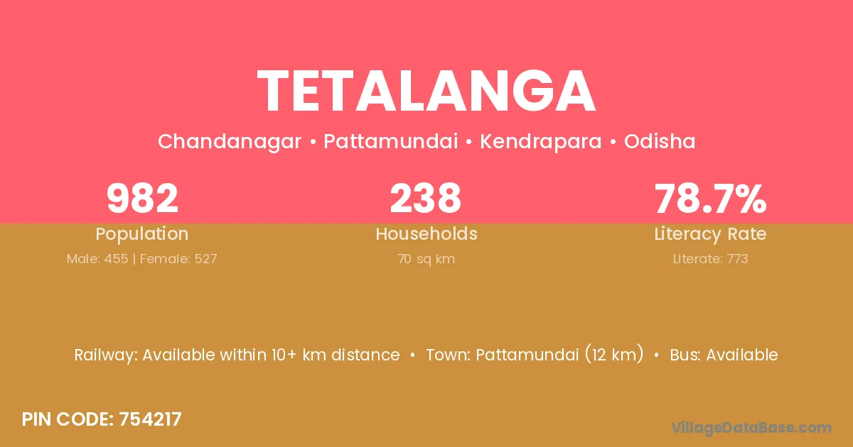 Pattamundai (12 km) is the nearest town to Tetalanga village for major economic activities and is located approximately 12 km away.