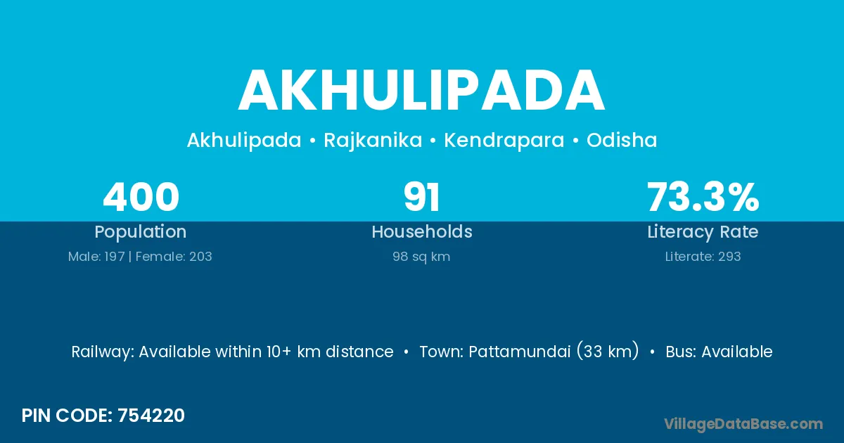 Pattamundai (33 km) is the nearest town to Akhulipada village for major economic activities and is located approximately 33 km away.