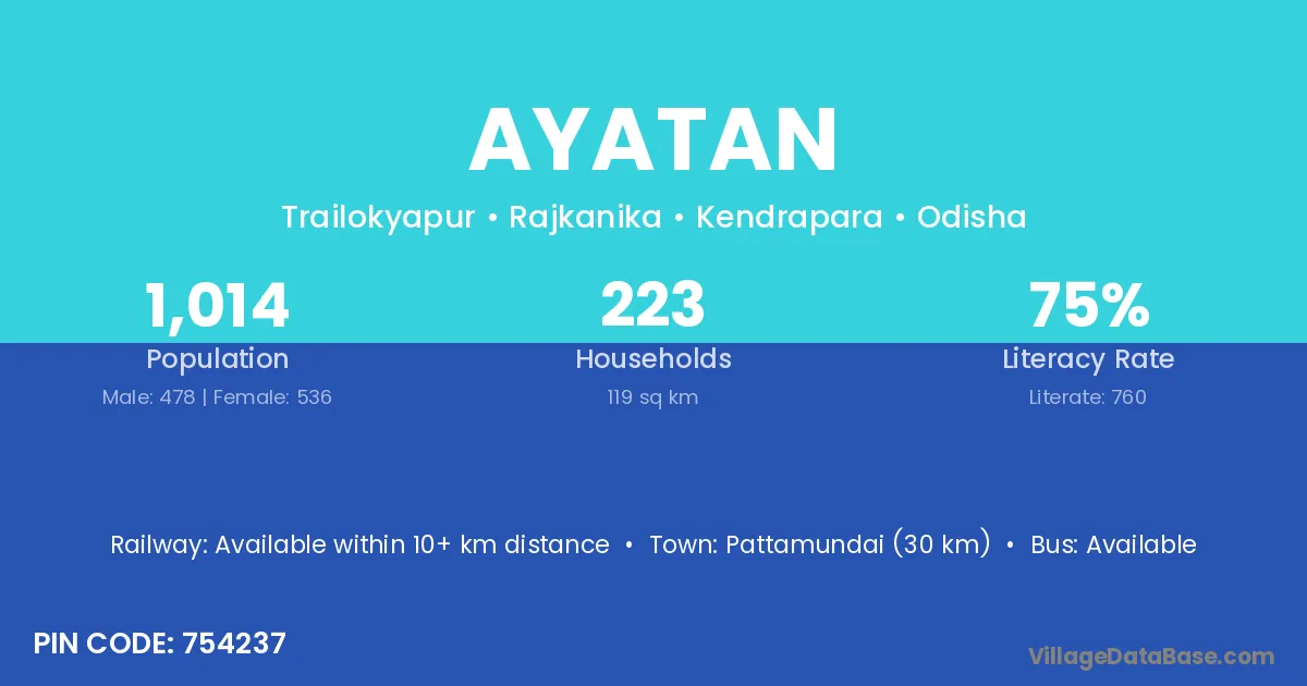 Pattamundai (30 km) is the nearest town to Ayatan village for major economic activities and is located approximately 30 km away.