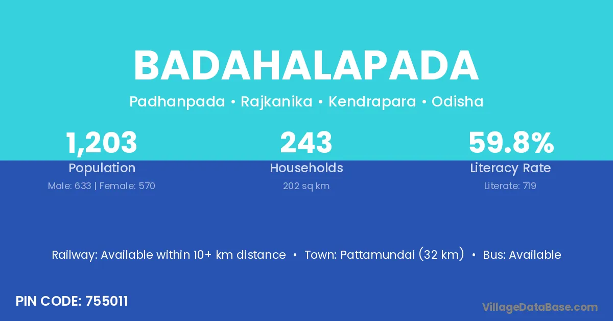 Pattamundai (32 km) is the nearest town to Badahalapada village for major economic activities and is located approximately 32 km away.