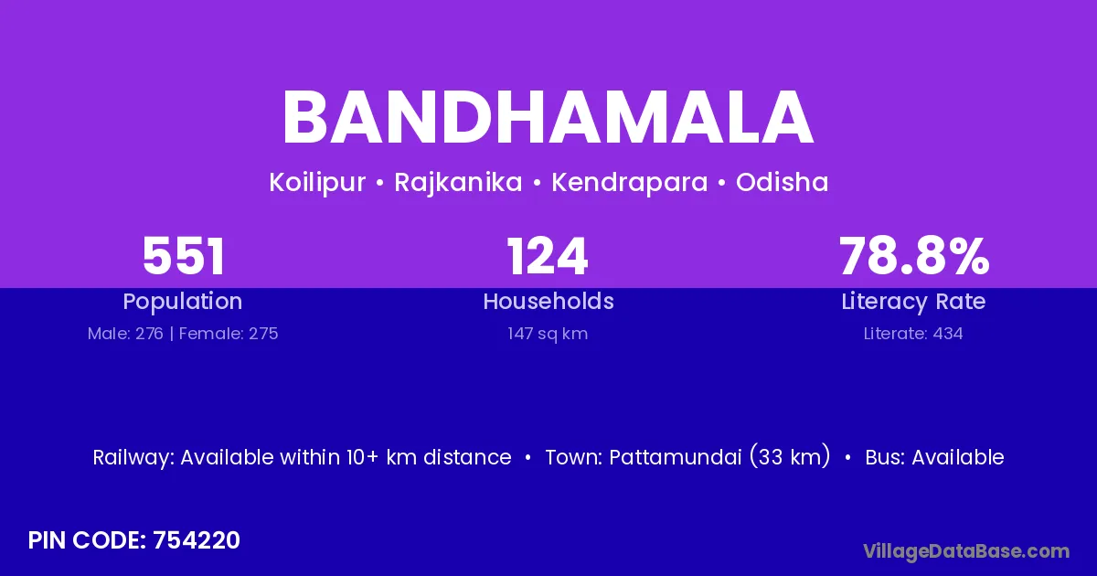 Pattamundai (33 km) is the nearest town to Bandhamala village for major economic activities and is located approximately 33 km away.