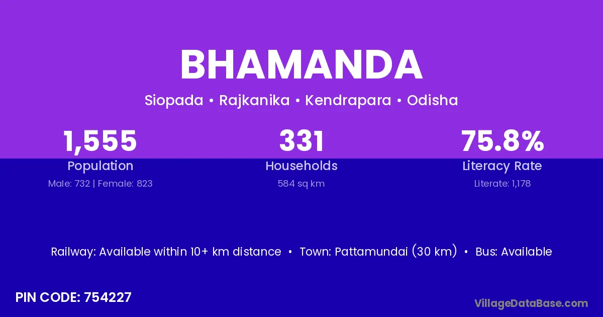 Pattamundai (30 km) is the nearest town to Bhamanda village for major economic activities and is located approximately 30 km away.