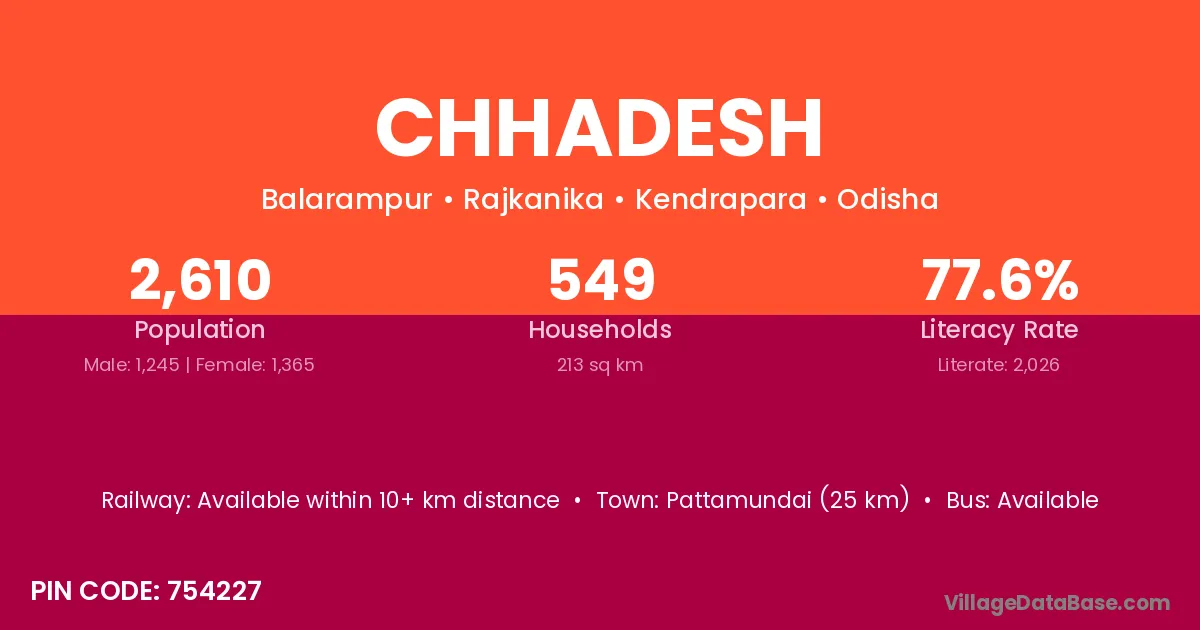 Pattamundai (25 km) is the nearest town to Chhadesh village for major economic activities and is located approximately 25 km away.