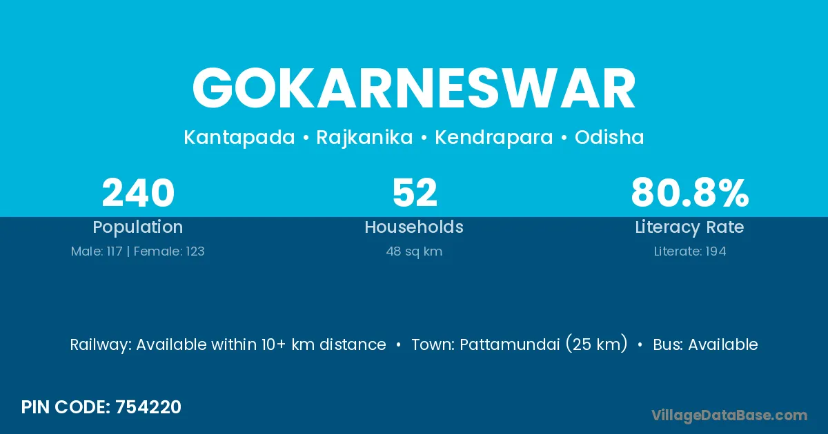 Pattamundai (25 km) is the nearest town to Gokarneswar village for major economic activities and is located approximately 25 km away.