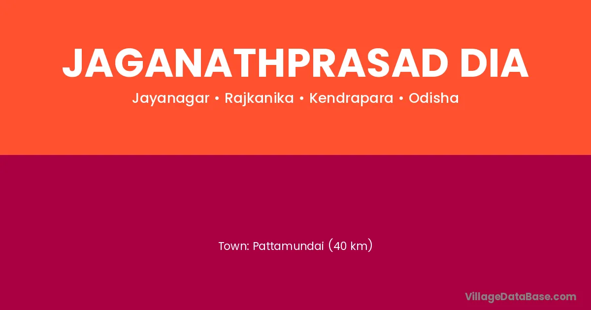 Pattamundai (40 km) is the nearest town to Jaganathprasad Dia village for major economic activities and is located approximately 40 km away.