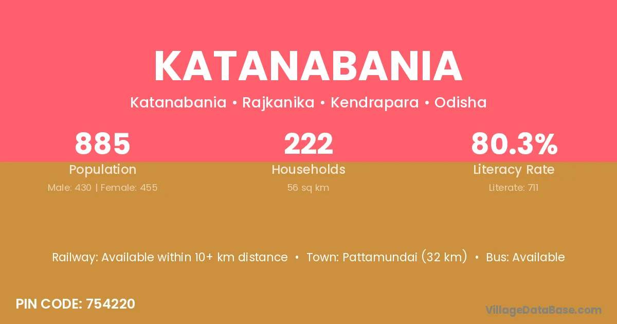 Pattamundai (32 km) is the nearest town to Katanabania village for major economic activities and is located approximately 32 km away.