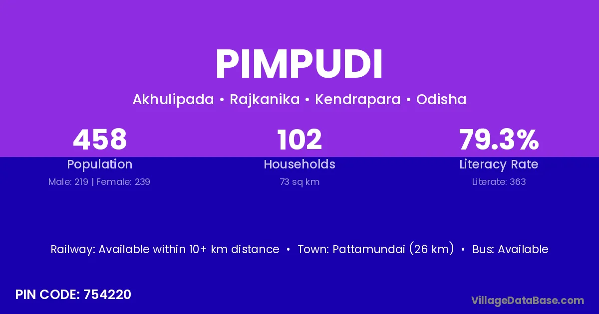 Pattamundai (26 km) is the nearest town to Pimpudi village for major economic activities and is located approximately 26 km away.