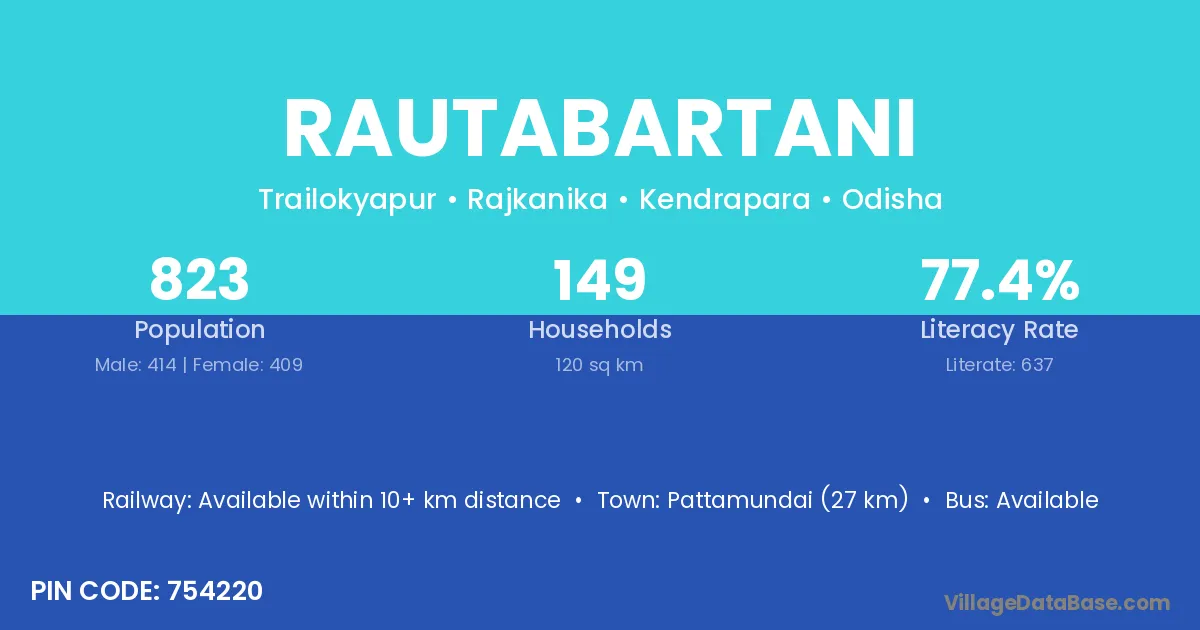 Pattamundai (27 km) is the nearest town to Rautabartani village for major economic activities and is located approximately 27 km away.