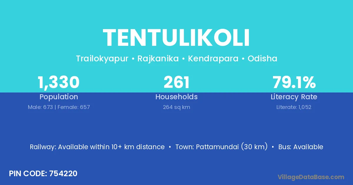 Pattamundai (30 km) is the nearest town to Tentulikoli village for major economic activities and is located approximately 30 km away.