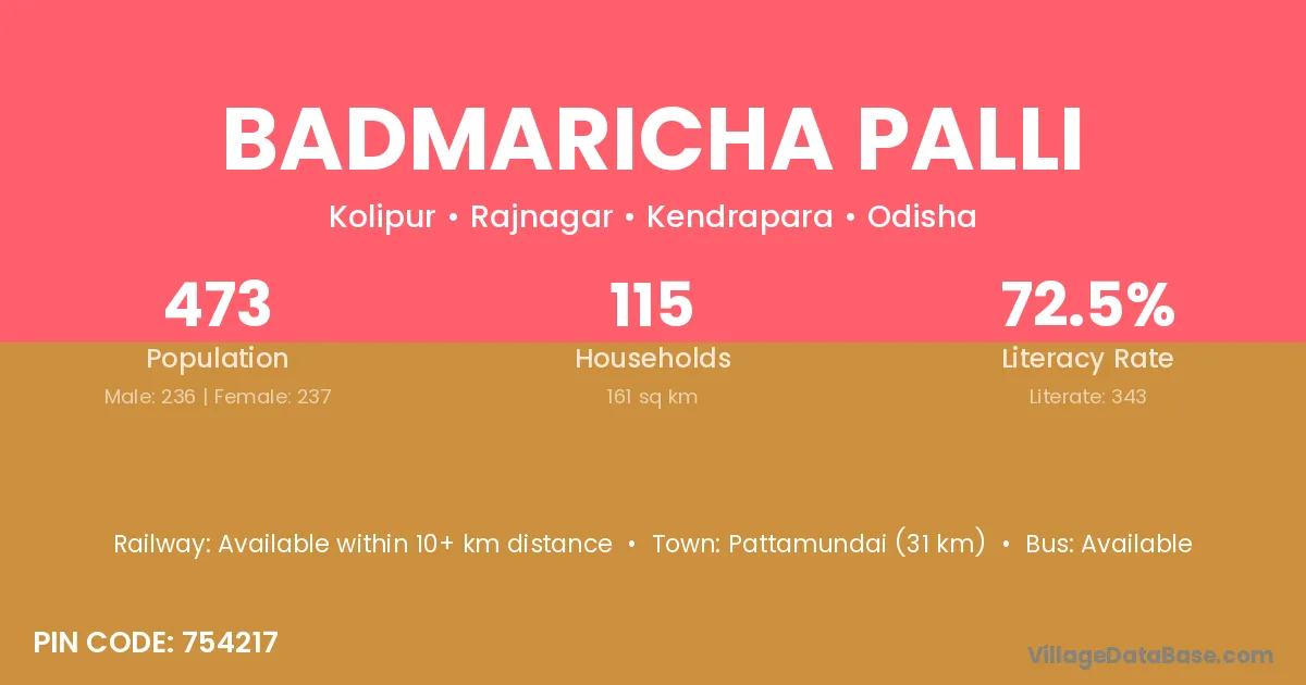 Pattamundai (31 km) is the nearest town to Badmaricha Palli village for major economic activities and is located approximately 31 km away.