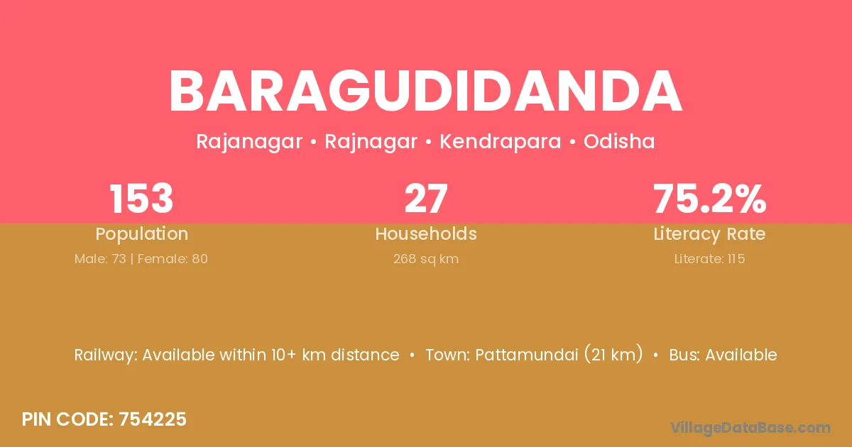 Pattamundai (21 km) is the nearest town to Baragudidanda village for major economic activities and is located approximately 21 km away.