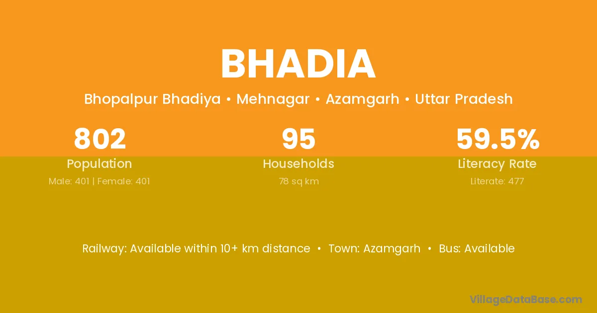 The literacy rate of Bhadia village is 74.85%. Male literacy stands at 79.01% and female literacy at 69.93%.