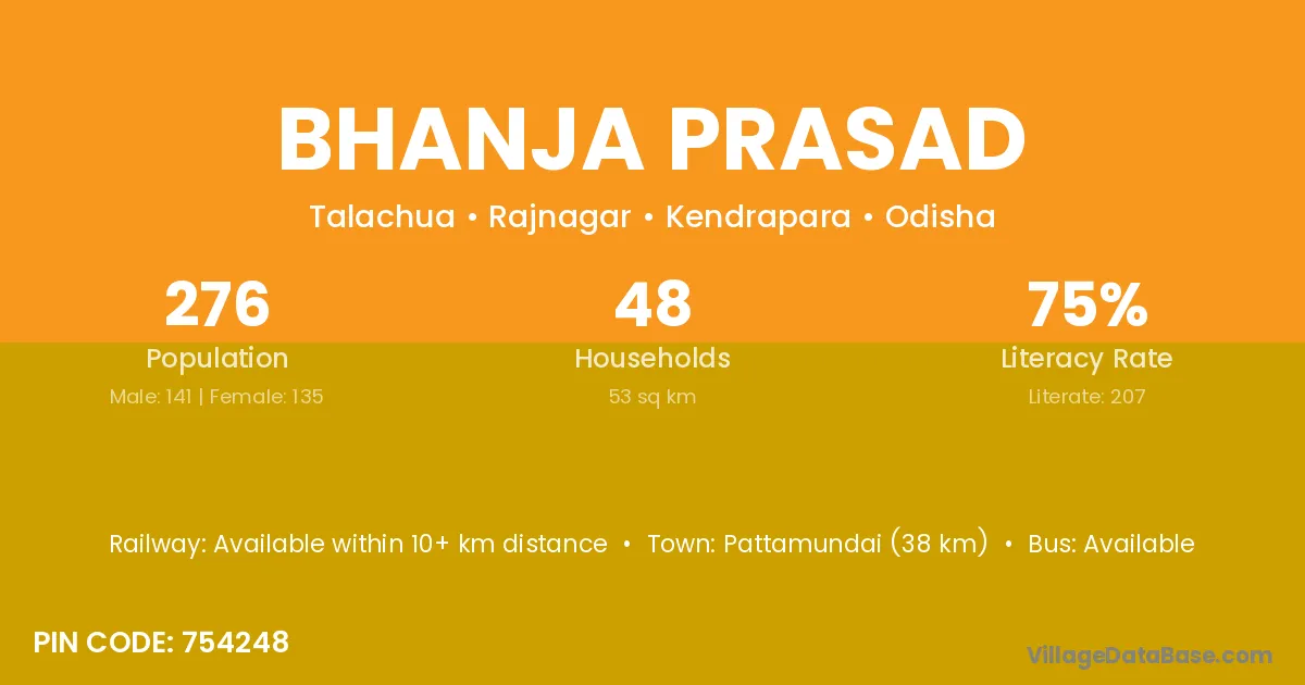 Pattamundai (38 km) is the nearest town to Bhanja Prasad village for major economic activities and is located approximately 38 km away.