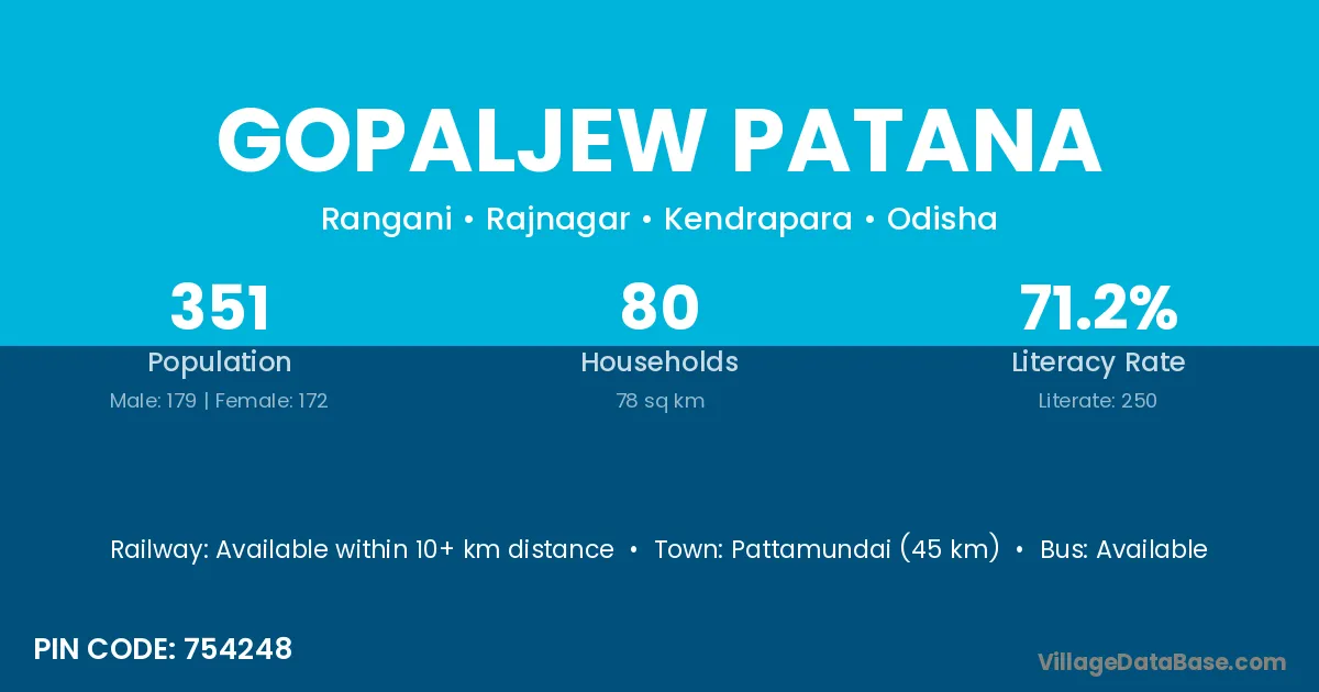 Pattamundai (45 km) is the nearest town to Gopaljew Patana village for major economic activities and is located approximately 45 km away.