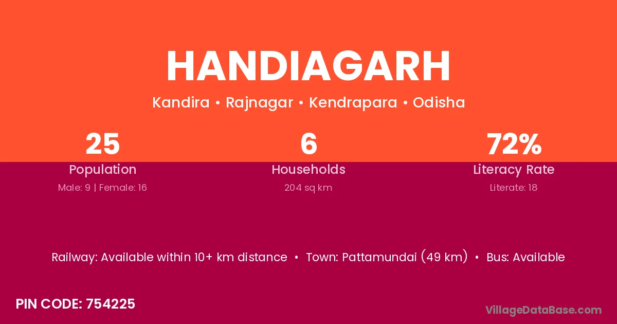 Pattamundai (49 km) is the nearest town to Handiagarh village for major economic activities and is located approximately 49 km away.