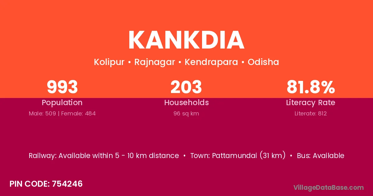 Pattamundai (31 km) is the nearest town to Kankdia village for major economic activities and is located approximately 31 km away.