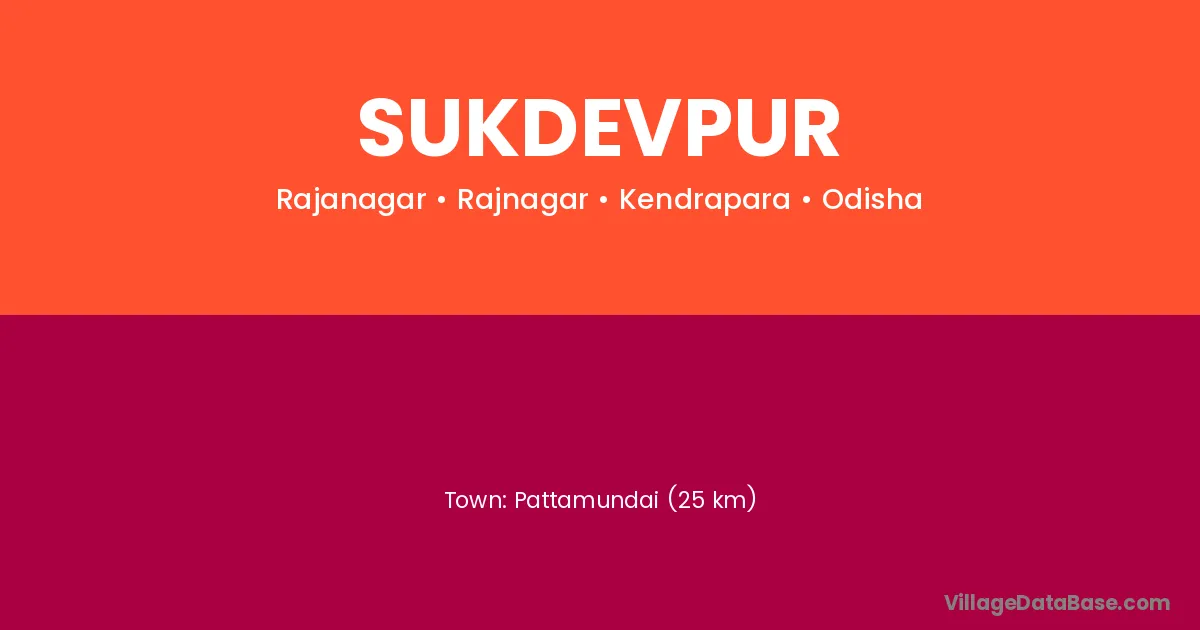 Pattamundai (25 km) is the nearest town to Sukdevpur village for major economic activities and is located approximately 25 km away.
