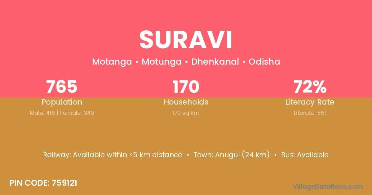 Pattamundai (40 km) is the nearest town to Suravi village for major economic activities and is located approximately 40 km away.