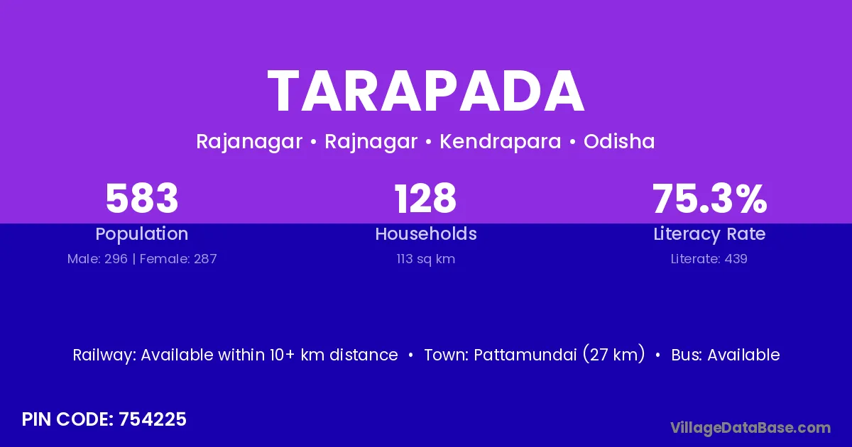 Pattamundai (27 km) is the nearest town to Tarapada village for major economic activities and is located approximately 27 km away.