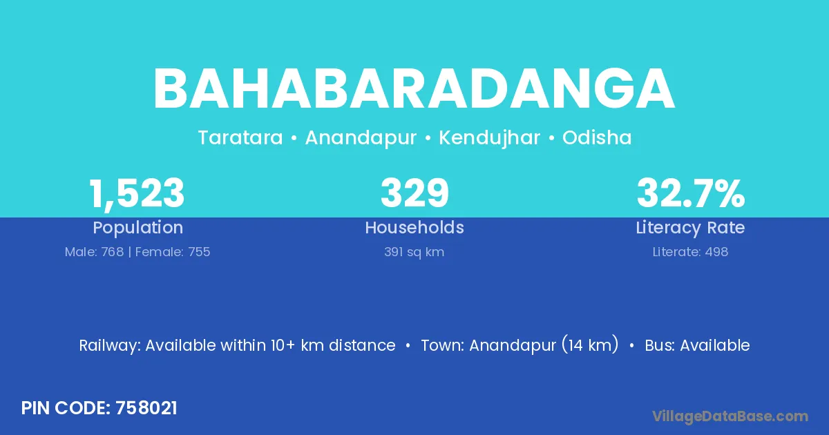 Bahabaradanga village has a total population of 1,523 people, of which 768 are males and 755 are females.