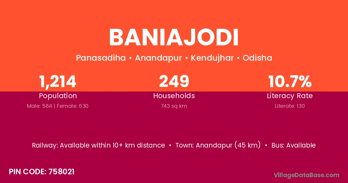 Anandapur (45 km) is the nearest town to Baniajodi village for major economic activities and is located approximately 45 km away.