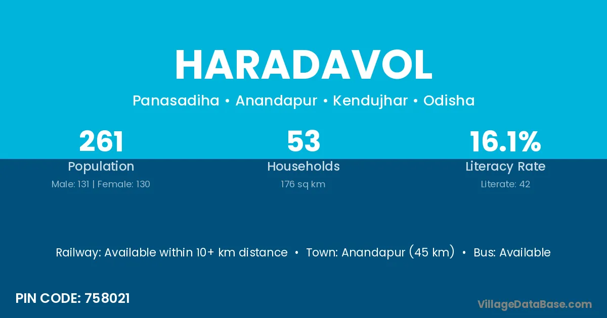 Anandapur (45 km) is the nearest town to Haradavol village for major economic activities and is located approximately 45 km away.