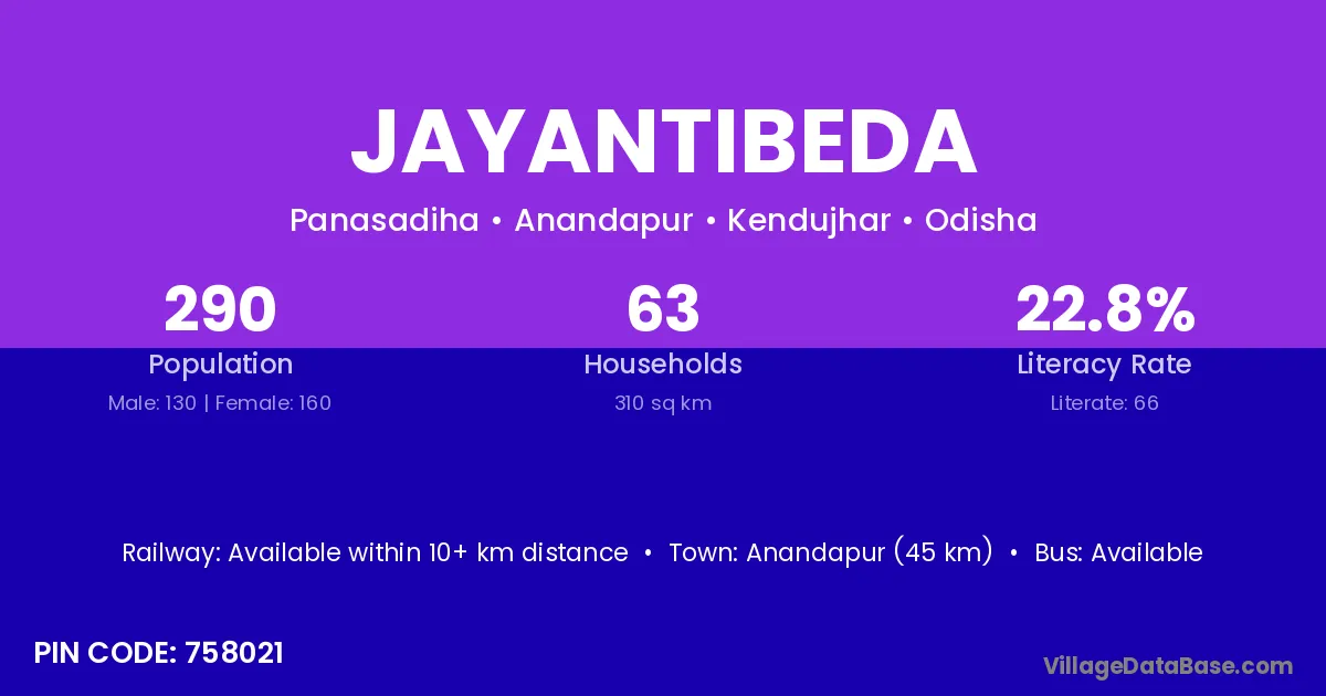 Anandapur (45 km) is the nearest town to Jayantibeda village for major economic activities and is located approximately 45 km away.