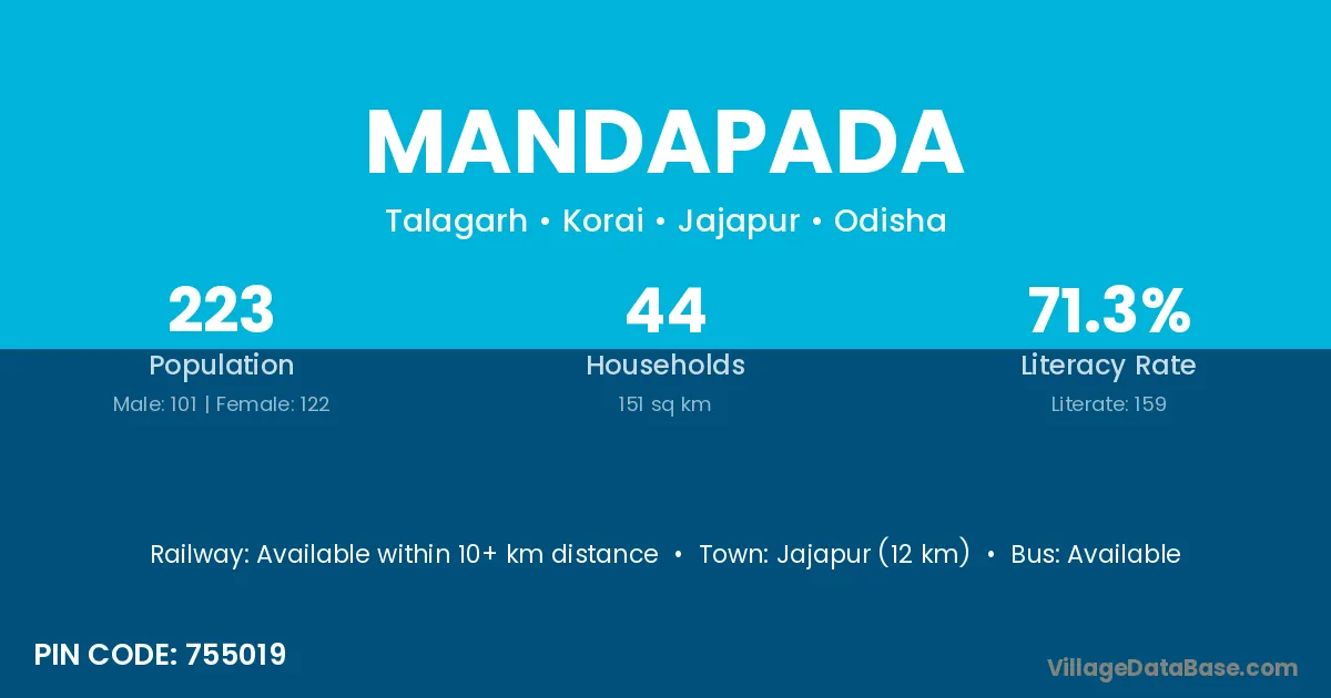 Anandapur (20 km) is the nearest town to Mandapada village for major economic activities and is located approximately 20 km away.