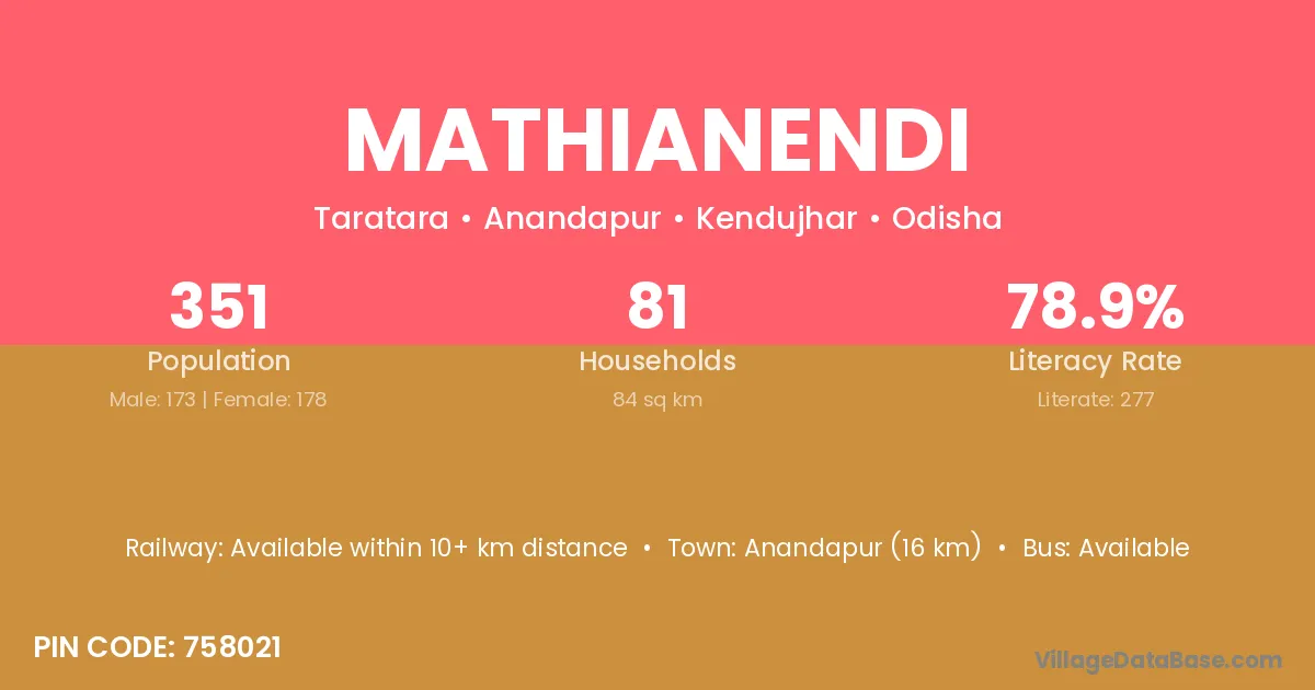 Anandapur (16 km) is the nearest town to Mathianendi village for major economic activities and is located approximately 16 km away.