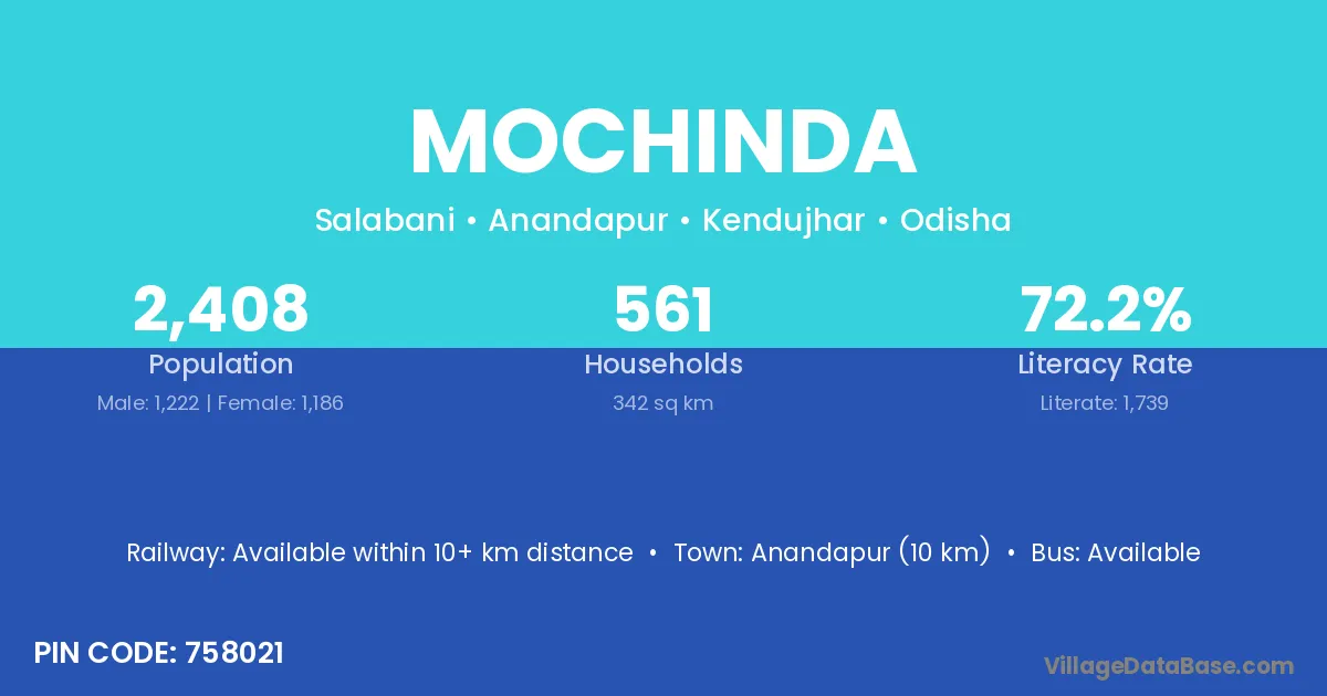 Anandapur (10 km) is the nearest town to Mochinda village for major economic activities and is located approximately 10 km away.
