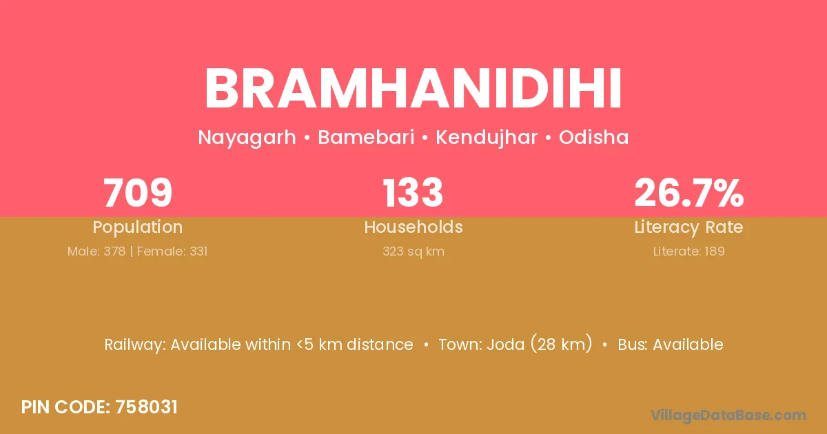 Joda (28 km) is the nearest town to Bramhanidihi village for major economic activities and is located approximately 28 km away.