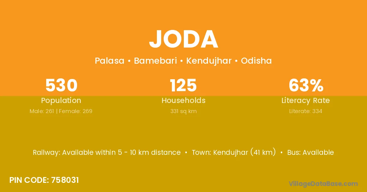 Kendujhar (41 km) is the nearest town to Joda village for major economic activities and is located approximately 41 km away.