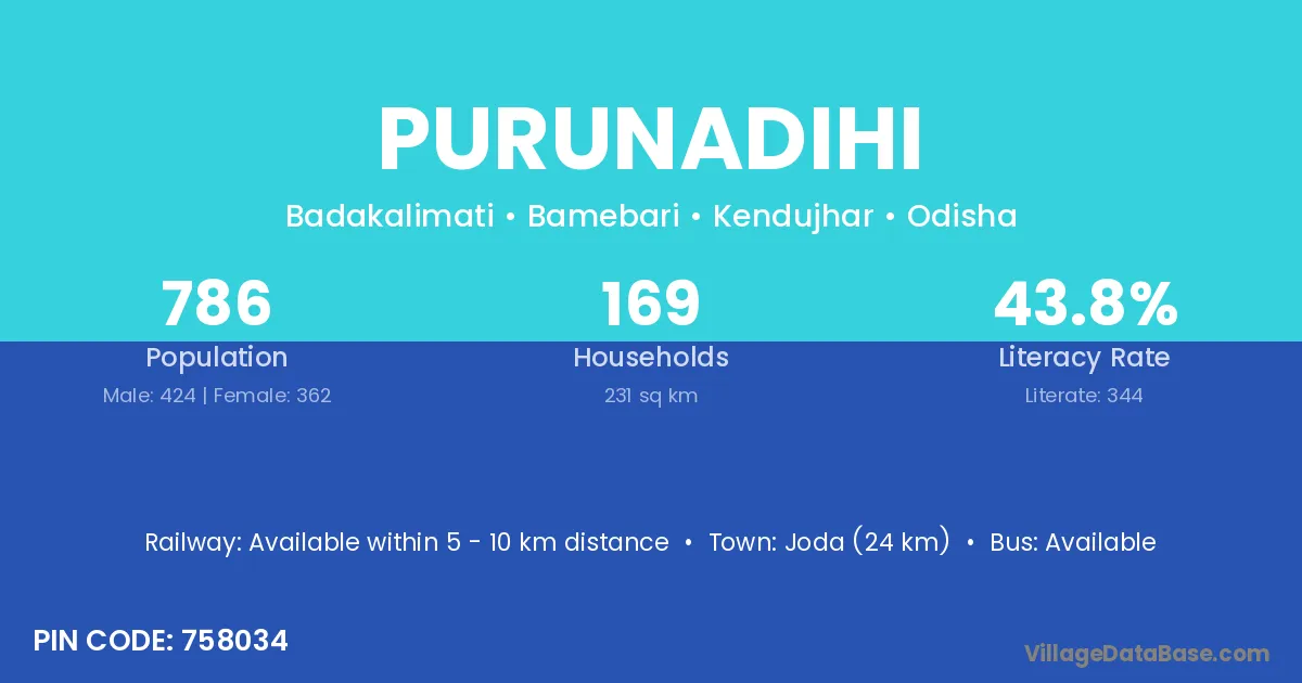 Joda (24 km) is the nearest town to Purunadihi village for major economic activities and is located approximately 24 km away.