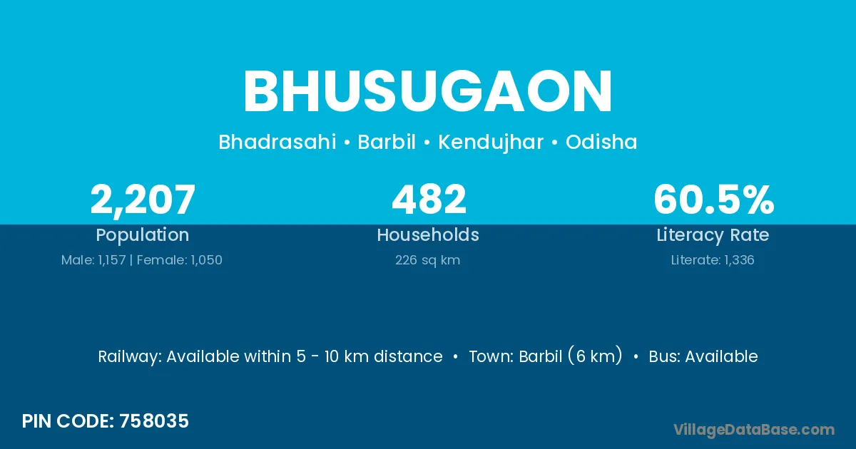 Barbil (6 km) is the nearest town to Bhusugaon village for major economic activities and is located approximately 6 km away.