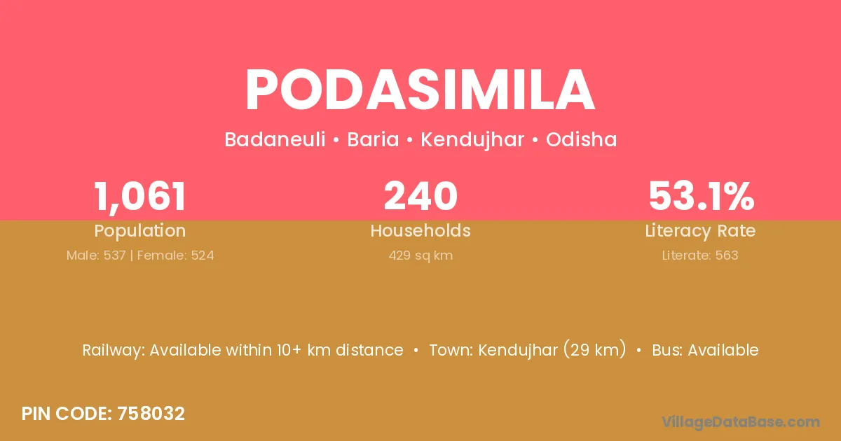Kendujhar (29 km) is the nearest town to Podasimila village for major economic activities and is located approximately 29 km away.