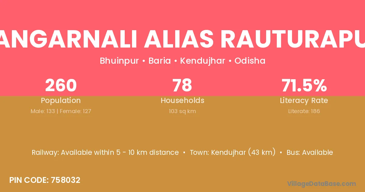 Kendujhar (43 km) is the nearest town to Tangarnali Alias Rauturapur village for major economic activities and is located approximately 43 km away.