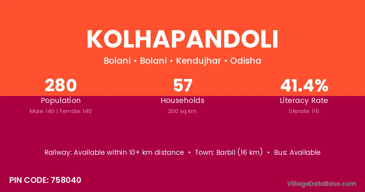 Barbil (16 km) is the nearest town to Kolhapandoli village for major economic activities and is located approximately 16 km away.