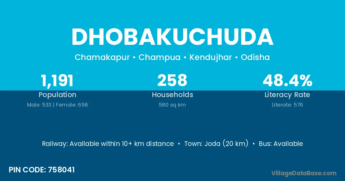 Joda (20 km) is the nearest town to Dhobakuchuda village for major economic activities and is located approximately 20 km away.