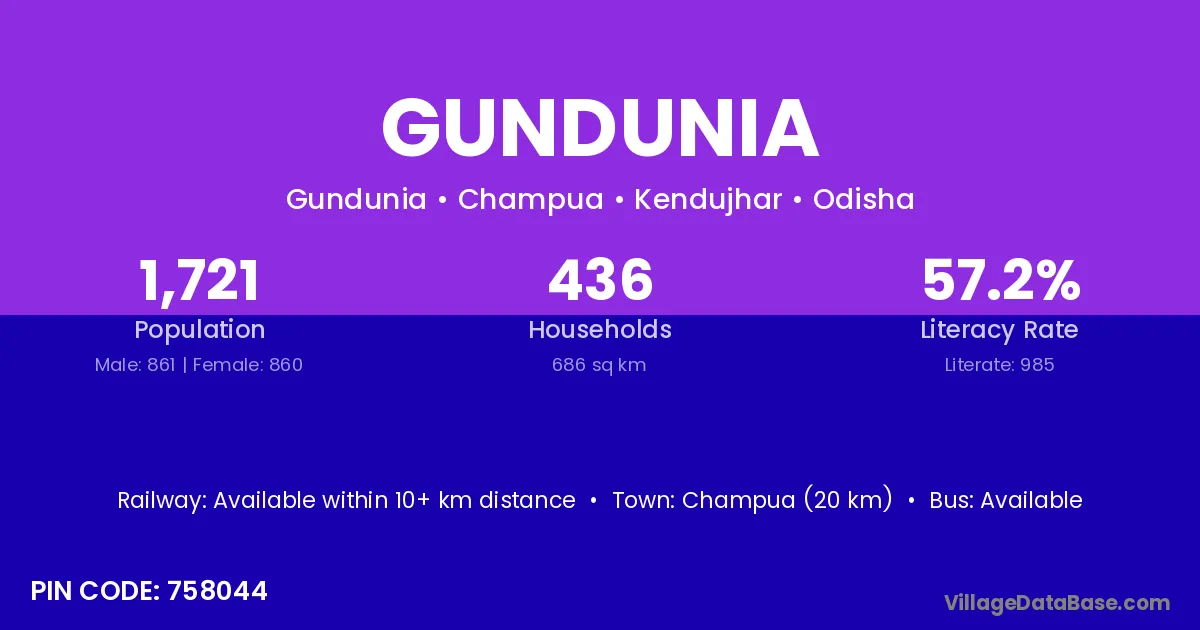 Champua (20 km) is the nearest town to Gundunia village for major economic activities and is located approximately 20 km away.