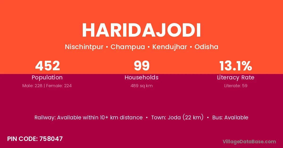Joda (22 km) is the nearest town to Haridajodi village for major economic activities and is located approximately 22 km away.