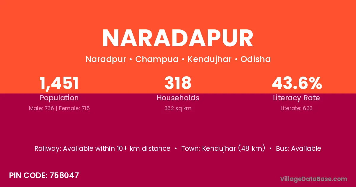 Kendujhar (48 km) is the nearest town to Naradapur village for major economic activities and is located approximately 48 km away.